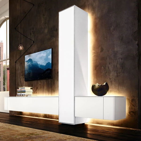 Für diese hülsta Gentis Wohnwand 1 ist die Installation einer indirekten Beleuchtung möglich (siehe Foto). Diese besteht aus einem Funktionsrahmen (Lack weiß) für jedes Element und der entsprechenden LED-Beleuchtung für die Funktionsrahmen. Gesteuert wird die Beleuchtung über eine Funkfernbedienung mit Farbtemperaturwechsel (kaltweiß – 6500K bis warmweiß – 2700K).