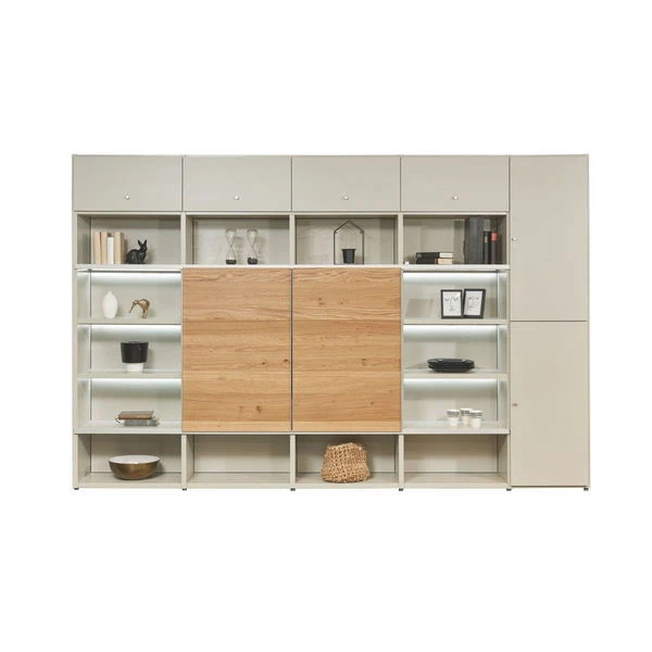 Die now! time by hülsta Kombination 4 in Natureiche/Lack-seidengrau ist eine Wohnwand mit Schiebetüren, offenen Fächern, Klappen und Drehtüren.