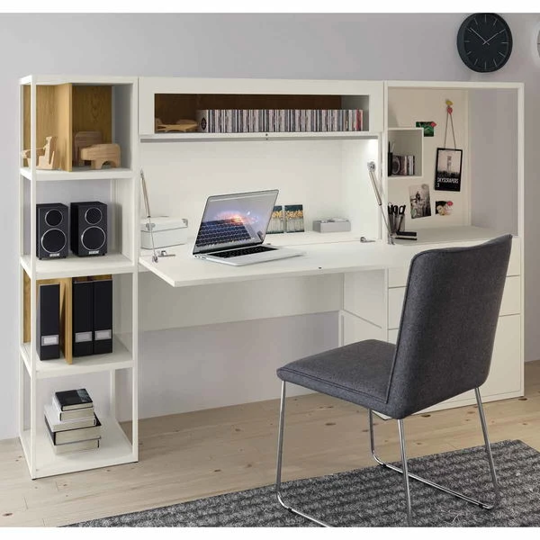 Die now! vision by hülsta Kombination 12 in Lack-weiß/Natureiche verfügt über drei Schubladen, ein Schreibfach sowie offene Fächer. Die now! Vision by hülsta Möbel fahren eine klare Linie und sind doch überaus wandelbar.