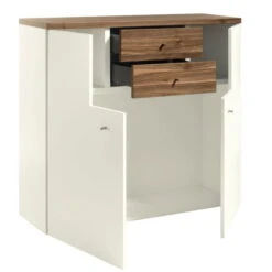 Der Korpus bei dieser Kombination ist in Lack-weiß und die Fronten in Natureiche, Lack-Hochglanz-weiß gehalten.