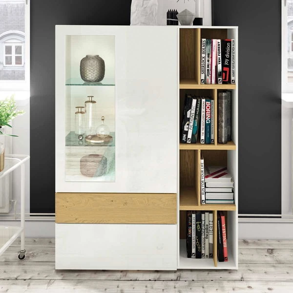 Die now! vision by hülsta Kombination 7 in Lack-weiß/Natureiche/Lack-Hochglanz-weiß verfügt über zwei Schubladen, eine Tür und ein Regal mit offenen Fächern. Die now! Vision by hülsta Möbel fahren eine klare Linie und sind doch überaus wandelbar. Die Oberflächen variieren von klassischen Lack- und Hochglanzlack-Fronten über Akzentausführungen bis hin zu hochwertigen Furnieren.