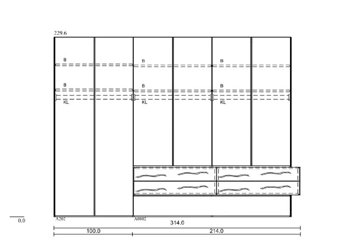 Breite: 314 cm (inkl. Überstand (Schubkästen): 315,6 cm)