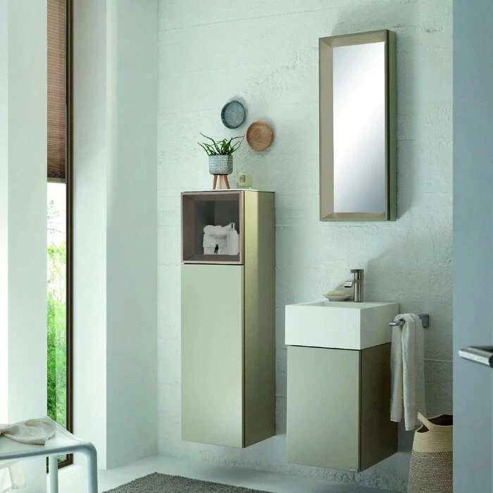 - Korpus aus Holzwerkstoff (Spanplatte) mit Lack in Seidengrau
